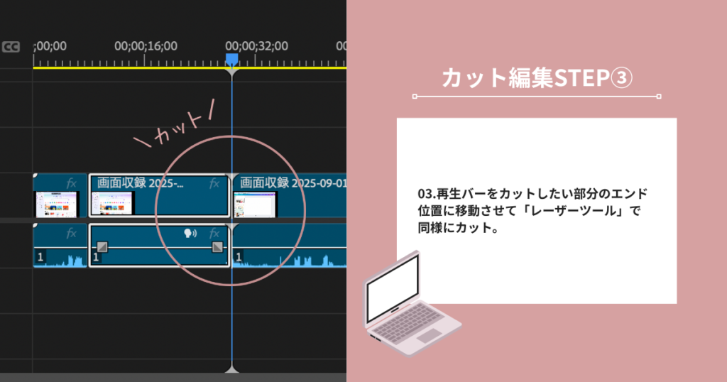 ③次に再生バーをカットしたい部分のエンド位置に移動させて「レーザーツール」でカット。