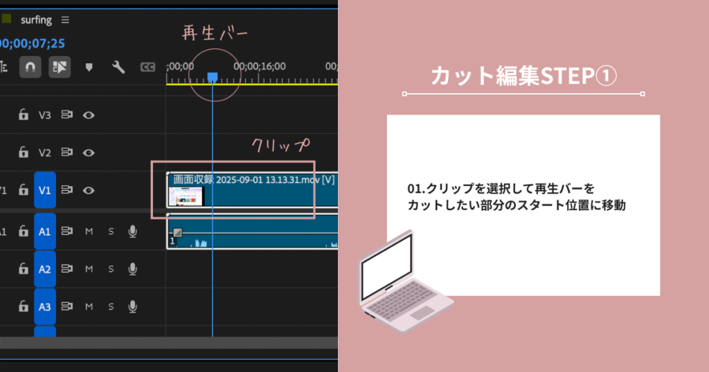 ①クリップを選択して再生バーをカットしたい部分のスタート位置に移動。