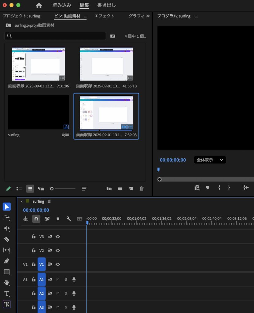 まりなこれでプレミアプロの中に動画が読み込まれ、カット編集の事前準備ができました。