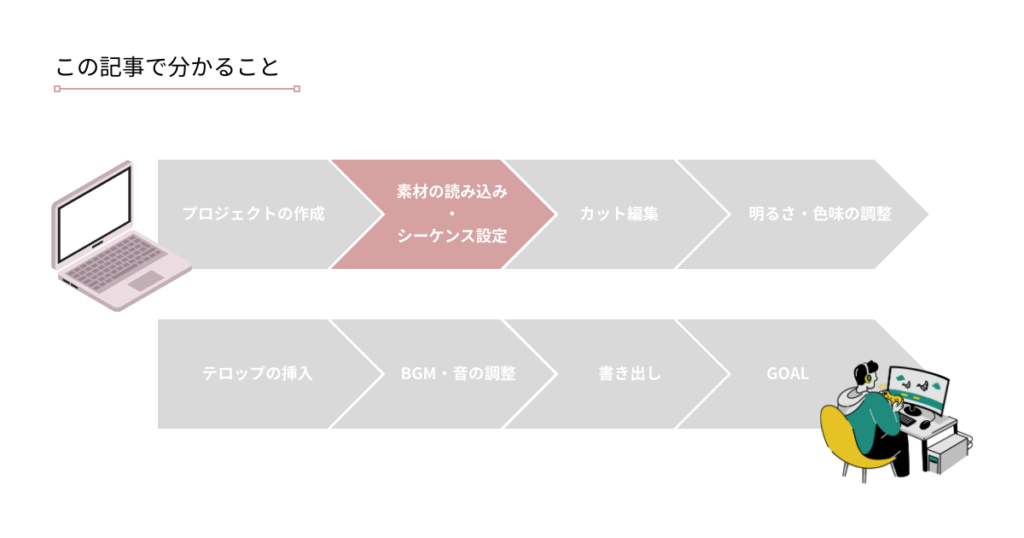 そんなプレミアプロ初心者のあなたに向けて、 音源読み込み〜シーケンス設定 まで、初心者でも迷わないようにやさしく解説していきます。