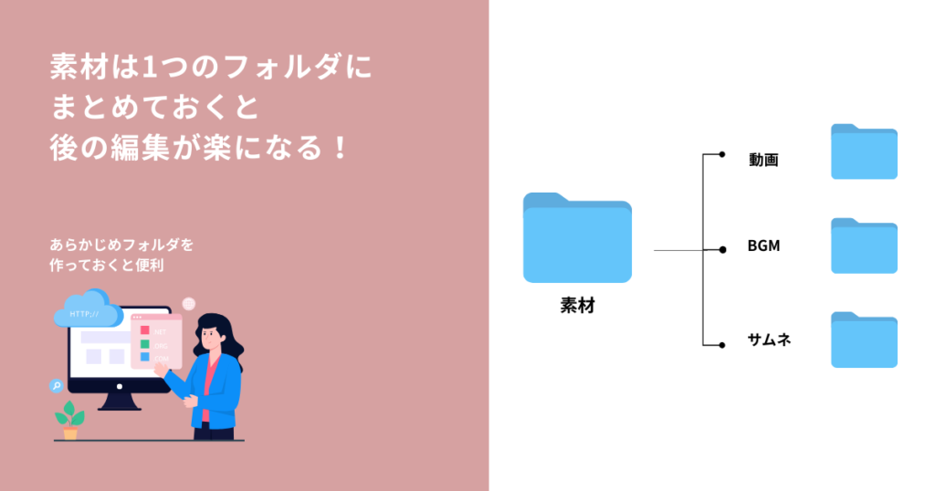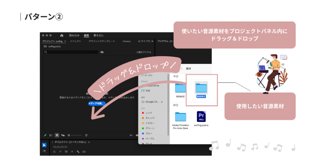 パソコンのフォルダを開き、使いたい音源素材をプロジェクトパネル内にドラッグ&ドロップで入れます。