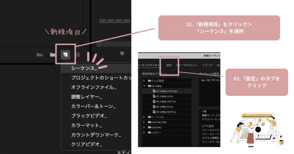 • プロジェクトパネル内の新規項目>シーケンスから4つの項目を設定をする